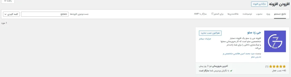 برای نصب افزونه جی زد سئو روی گزینه افزودن افزونه در منوی های وردپرس کلیک کنید و در باکس سرچ “gzseo” رو سرچ کنید.